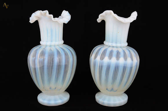 Par de vasos de opalina européia com "listras" na cor creme, bordas feitio babado. Altura 24 cm cada.