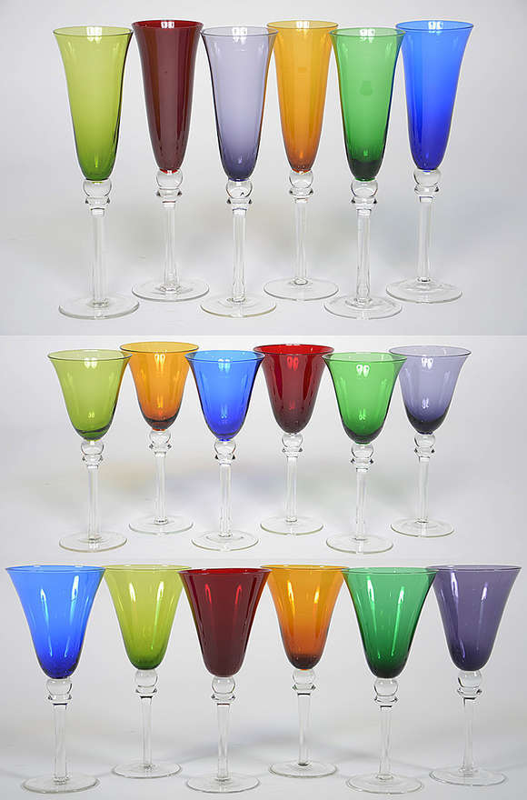 Jogo com 18 copos em diversas cores, sendo 6 para água, 6 para vinho e 6 para champagne.