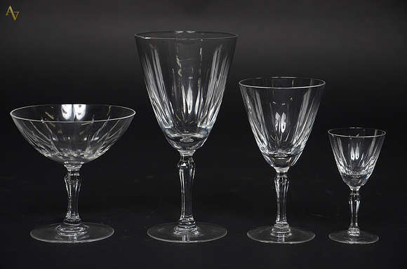 Serviço de cristal, sendo: 6 para champagne, 6 para água, 4 para vinho e 6 para licor. Total de 22 peças (uma com bic...