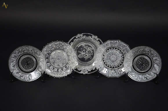 Cinco antigos pratos de cristal lapidado (possivelmente Bacarat). Diâmetros de 19 à 22,5 cm. Pequenos bicados na part...