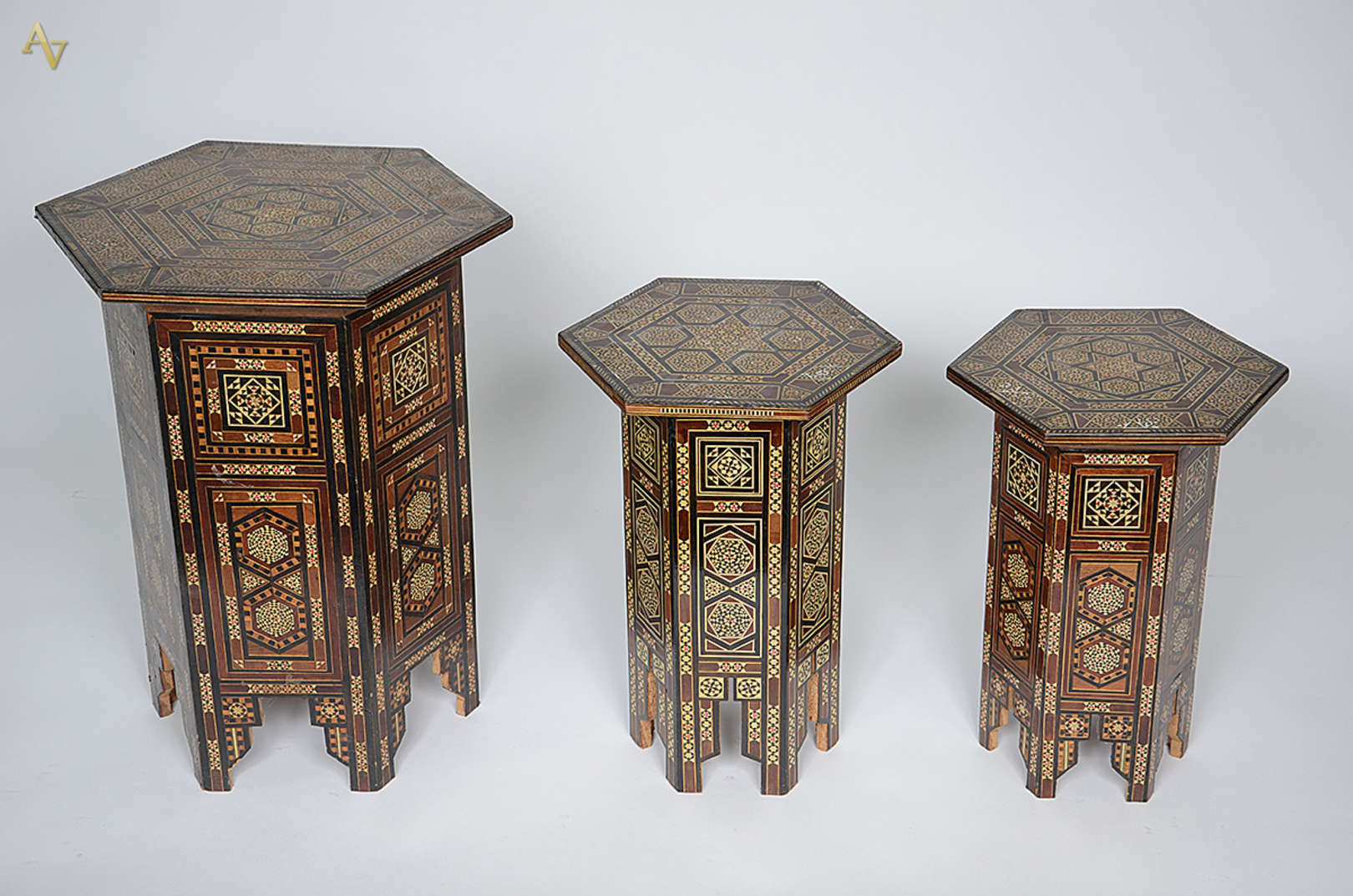 Mesa redonda com entalhes e detalhes em marfim em forma de cabeça de elefantes. Diâmetro 61 cm e altura 63 cm.