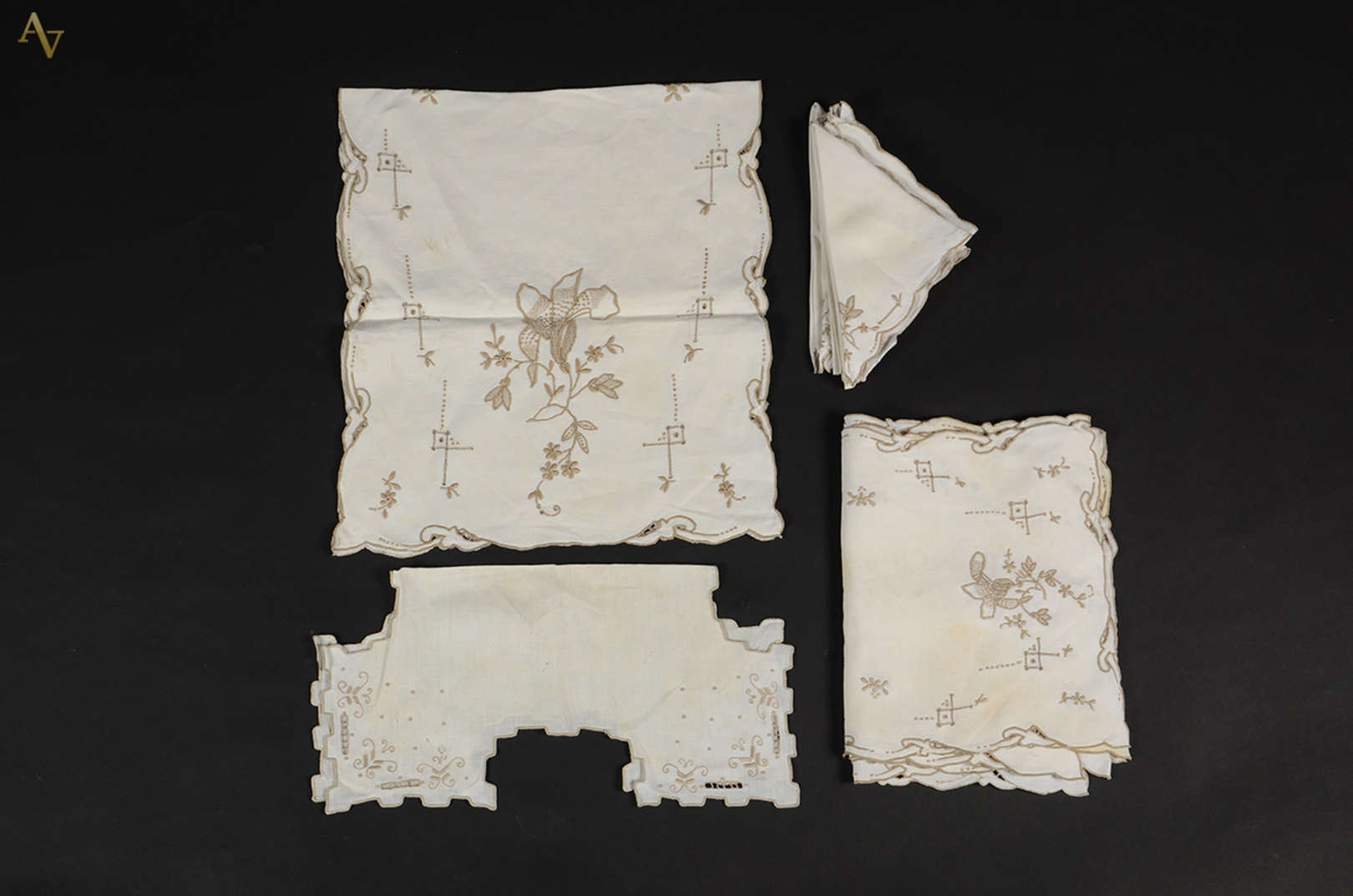 Toalha de linho Ilha da Madeira na cor bege com 11 guardanapos. Medidas 1,76 x 2,36 m (pequeno rasgado).