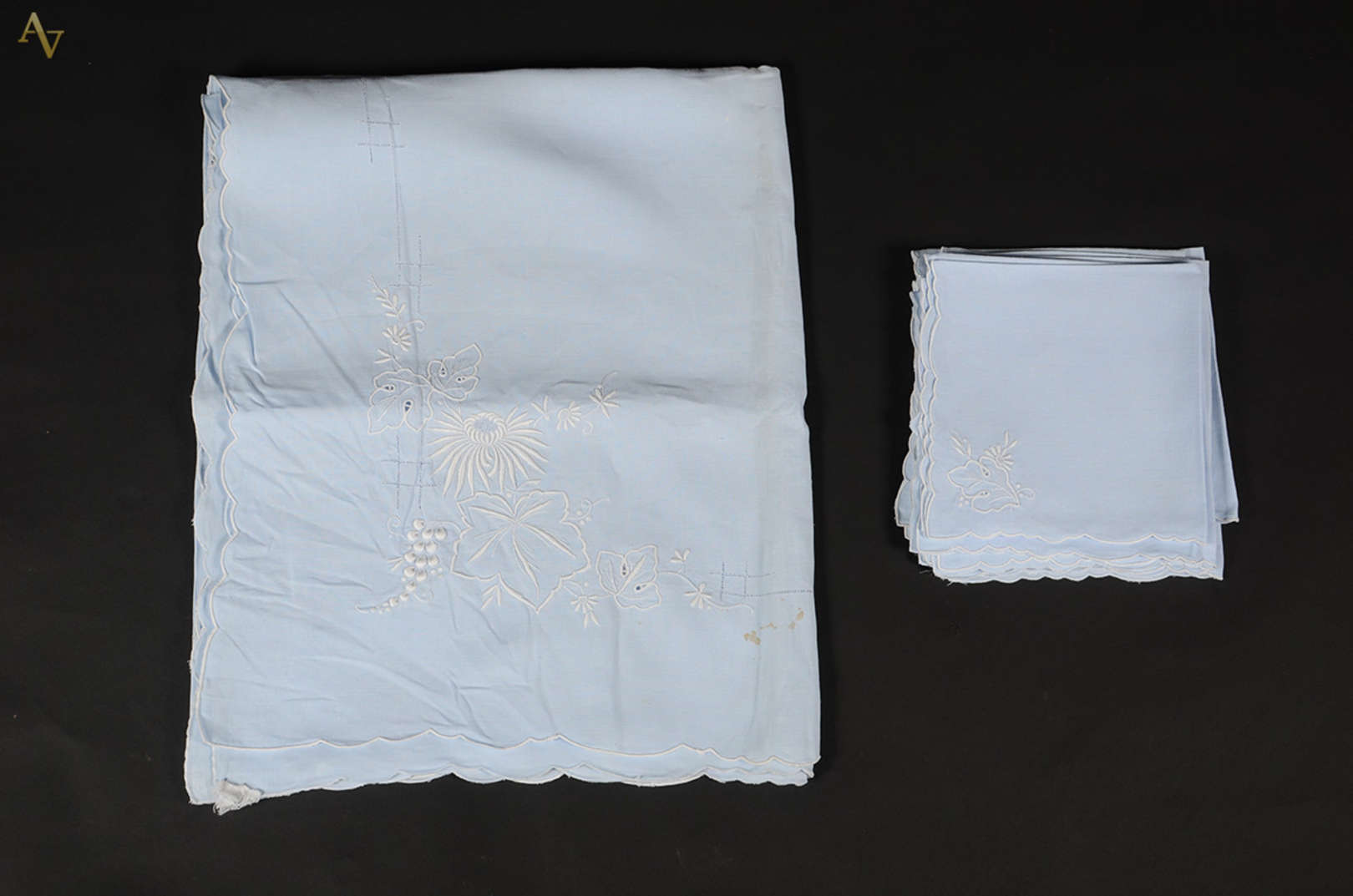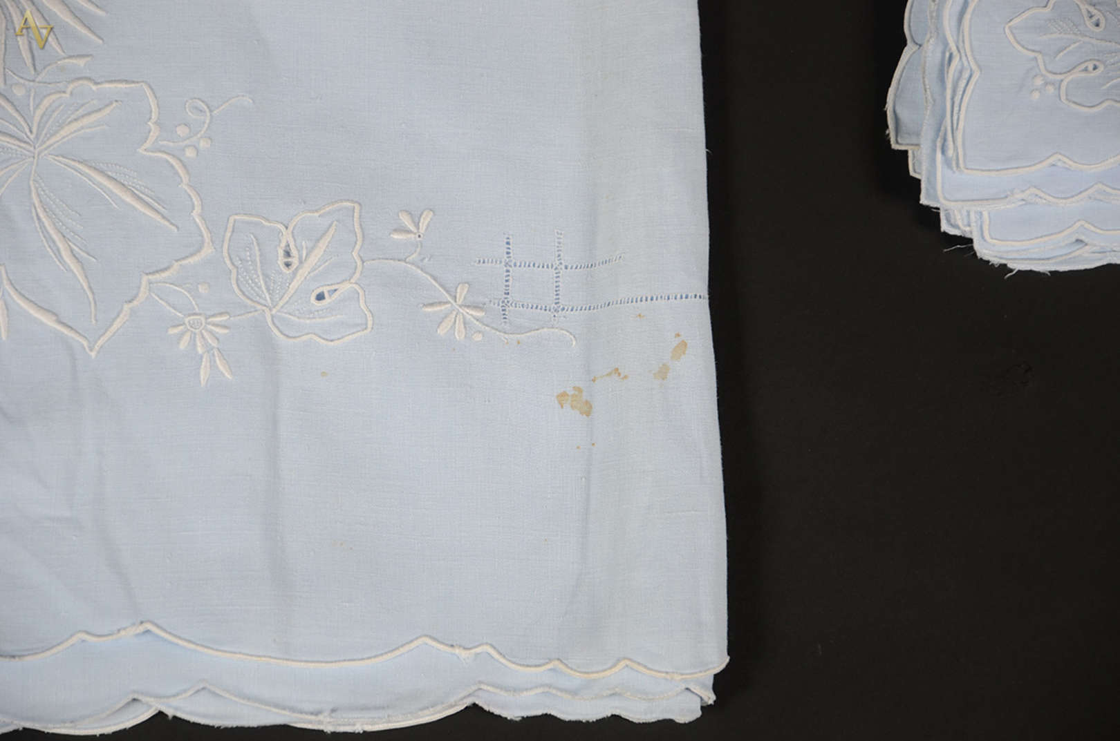 Toalha branca de linho com bordados azuis e 11 guardanapos. Medidas 2,15 x 1,44 m (pequenas manchas de guardado).