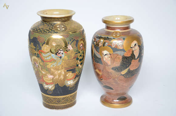 Dois vasos de faiança japonesa de Satzuma decorados com figuras em policromia e realces dourados. Alturas 37 cm e 40 ...