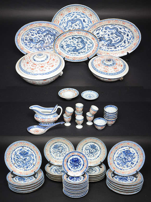 Serviço de jantar de porcelana oriental, sendo: 12 pratos, 12 bowls, 11 copos para sakê, 11 colheres para molho, 12 p...