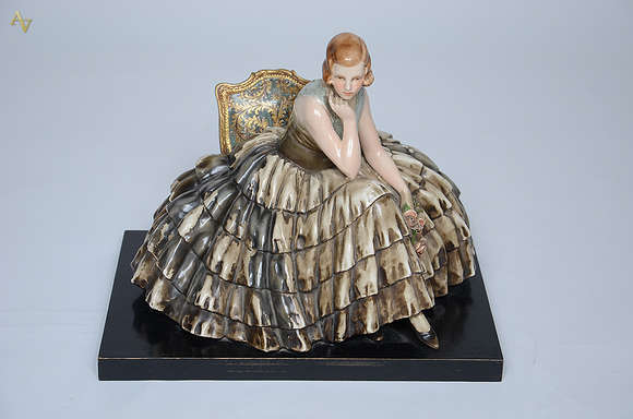 Boneca italiana de faiança com base em madeira, assinada. Altura 30 cm.