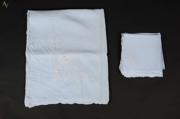 Toalha azul de linho com bordados e 10 guardanapos. Medidas 1,78 x 2,14 m (com manchas de guardado).