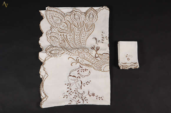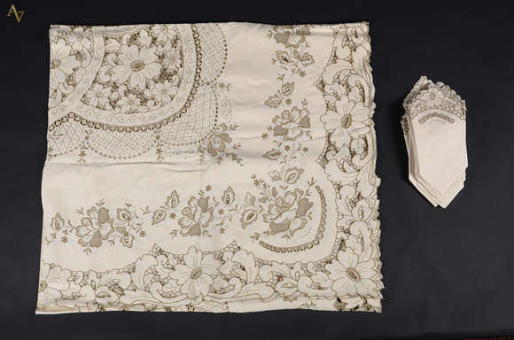 Toalha de linho Ilha da Madeira na cor bege com 11 guardanapos. Medidas 1,76 x 2,36 m (pequeno rasgado).