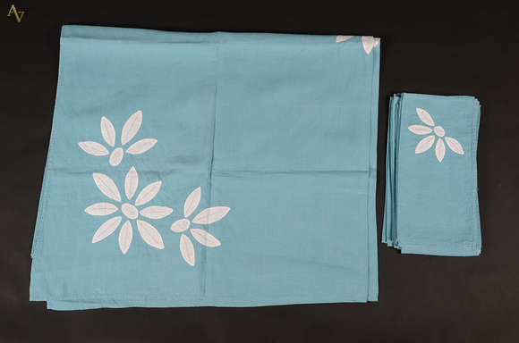 Toalha de linho na cor azul com flores brancas, acompanha 12 guardanapos. Medidas 2,60 x 1,54 m (com manchas de guard...