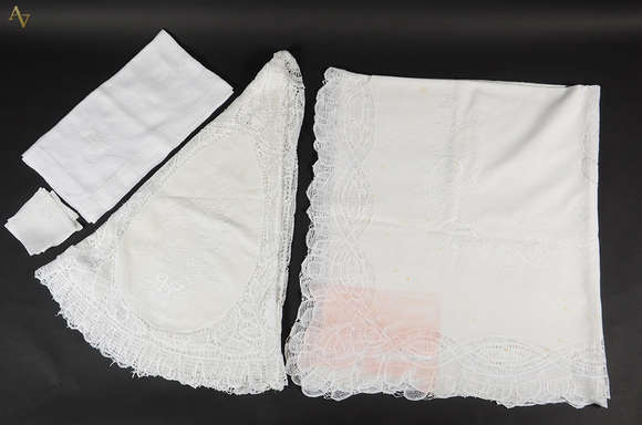 Três toalhas brancas de linho com renda, sendo uma quadrada (1,01 x 1,01 m), retangular (2,80 x 1,64 m) e uma redonda...