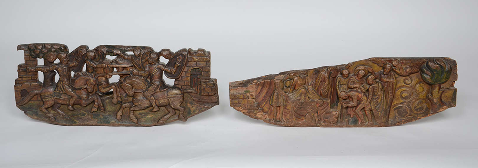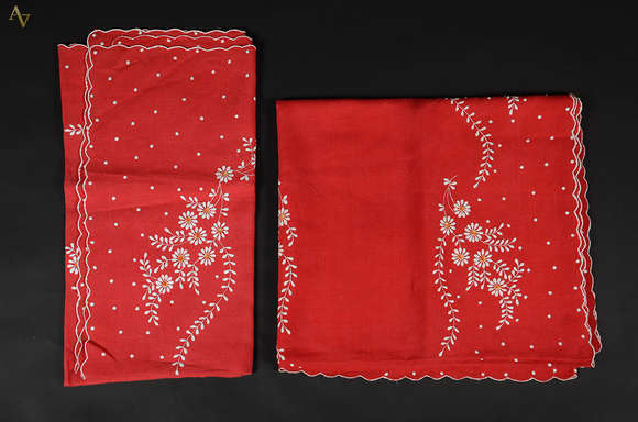 Duas toalhas vermelhas de linho com bordados. Medidas 1,25 x 1,25 m e 2,15 x 1,90 m.