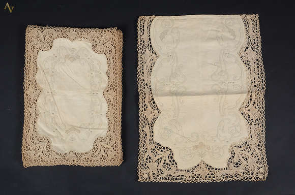 Conjunto com 25 peças, sendo uma toalha azul de linho com renda (medidas 1,70 x 2,60 m) e 12 guardanapos, 6 jogos ame...