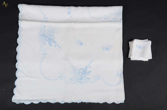 Toalha branca de linho com bordados azuis e 11 guardanapos. Medidas 2,15 x 1,44 m (pequenas manchas de guardado).