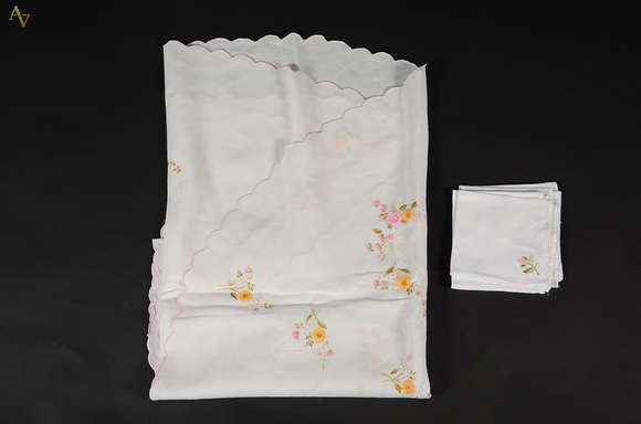 Toalha de linho branco redonda com bordados coloridos e seis guardanapos. Diâmetro 2,08 m.