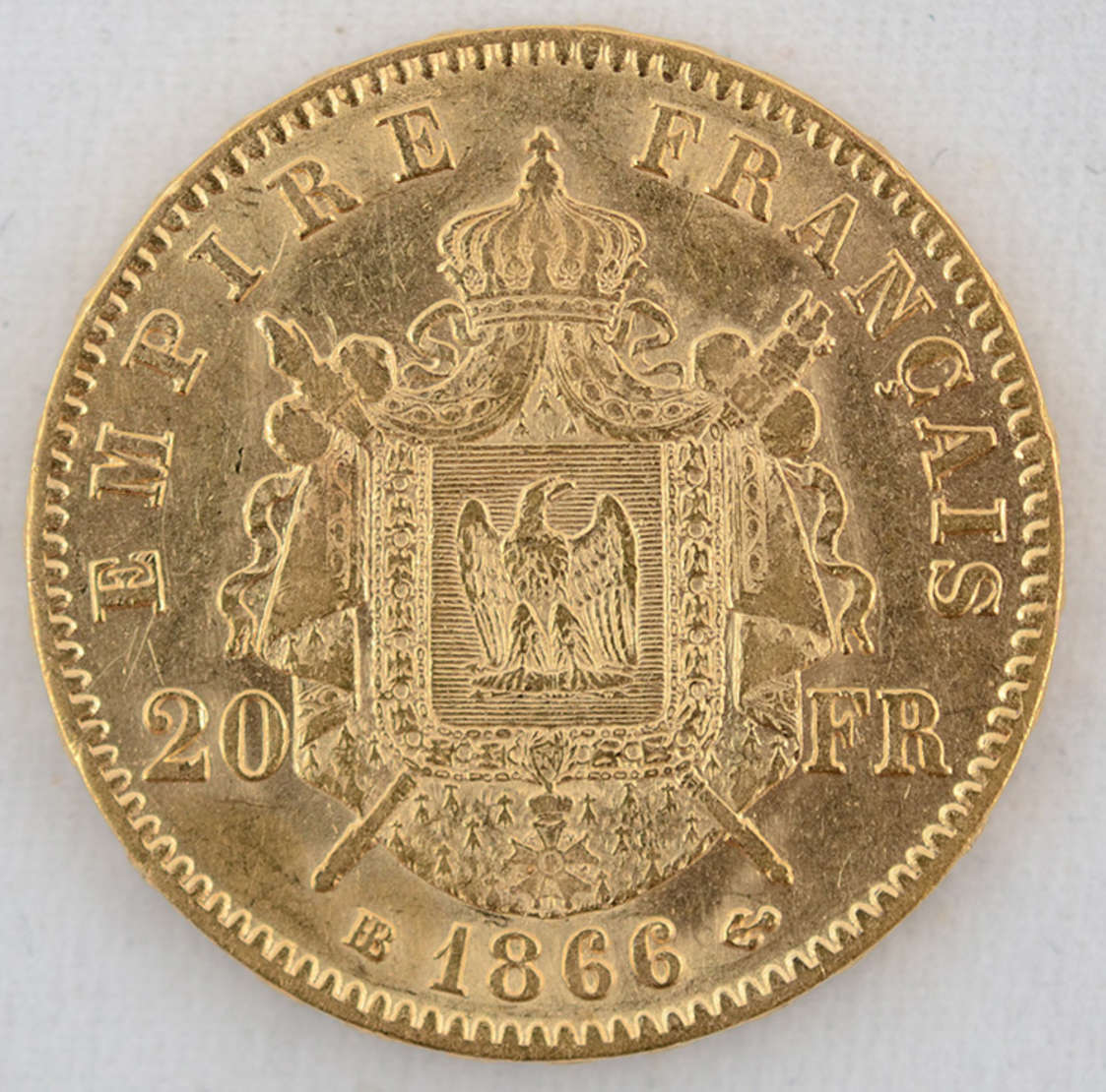 Moeda 20 francos - França 1866, flor de cunho, 900 milésimos - Peso total 6,45 g.