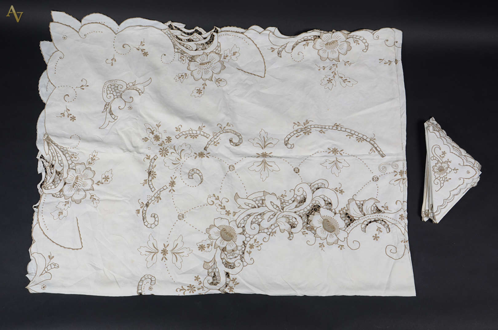 Toalha de mesa de linho bege com bordados da Ilha da Madeira, 12 guardanapos (manchas de guardado ). Medidas 2,80 x 1...