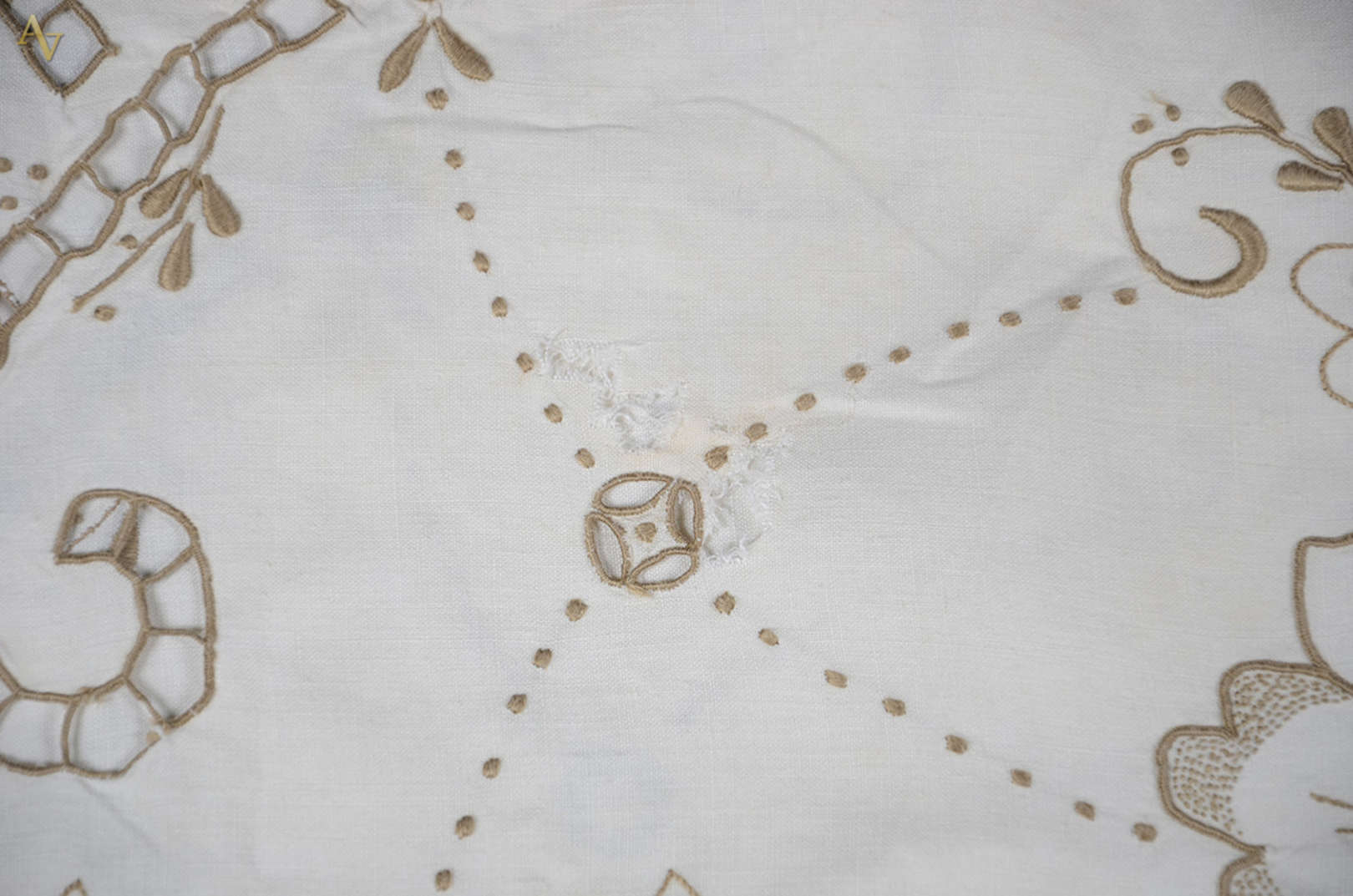 Toalha de linho branco com labirinto. Medidas 2,70 x 1,60 m.