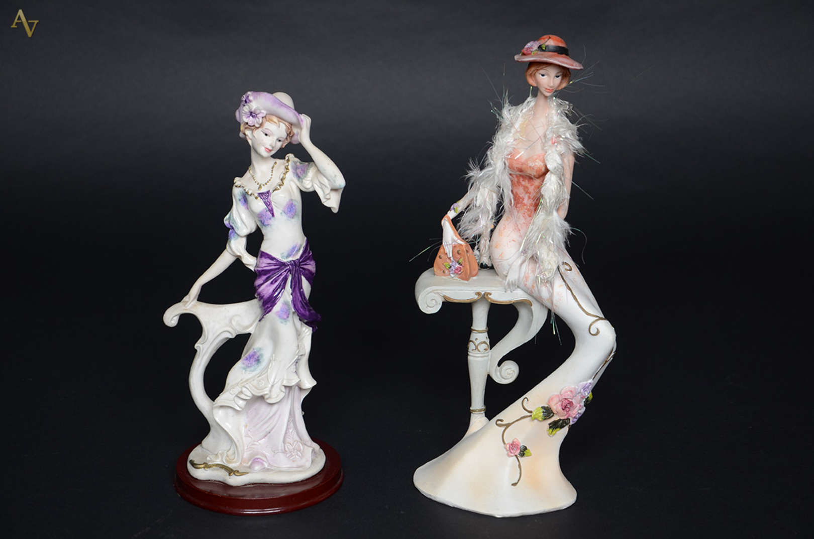 Duas esculturas de resina representando figuras femininas. Altura 20 cm cada.
