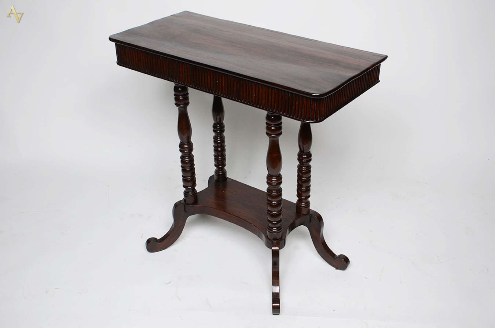 Mesa de encostar de madeira nobre, uma gaveta com chave, tampo com parte central parquetada, quatro pernas recurvas l...