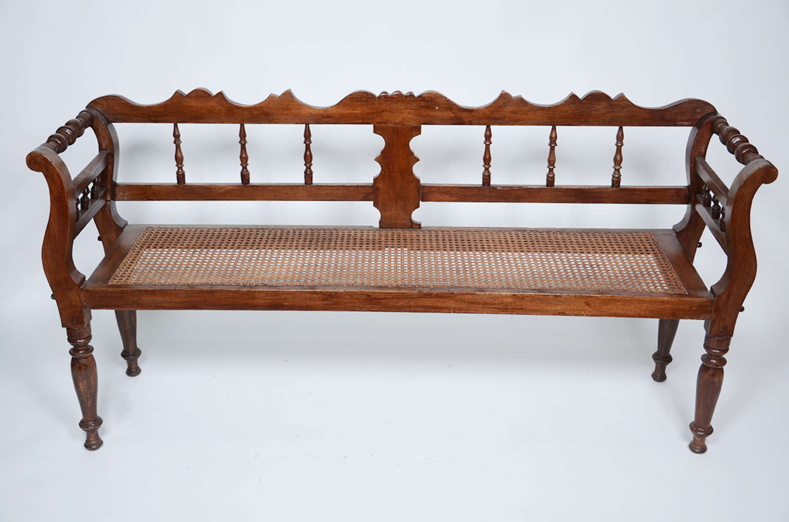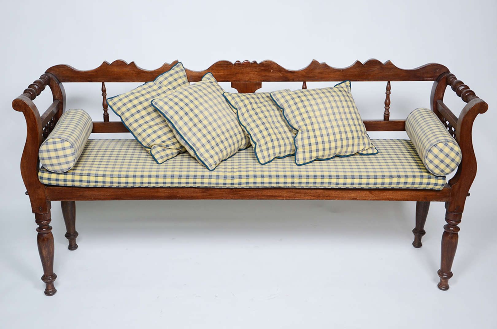 Mesa de encostar de madeira nobre, uma gaveta com chave, tampo com parte central parquetada, quatro pernas recurvas l...