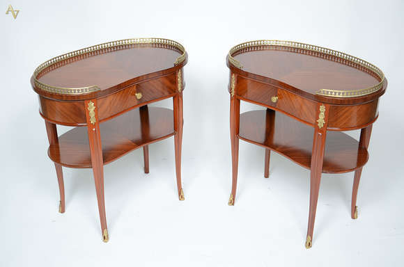 Par de mesinhas feitio "rim" de madeira nobre parquetada, galerias de bronze, uma gaveta cada e platô inferior. Medid...