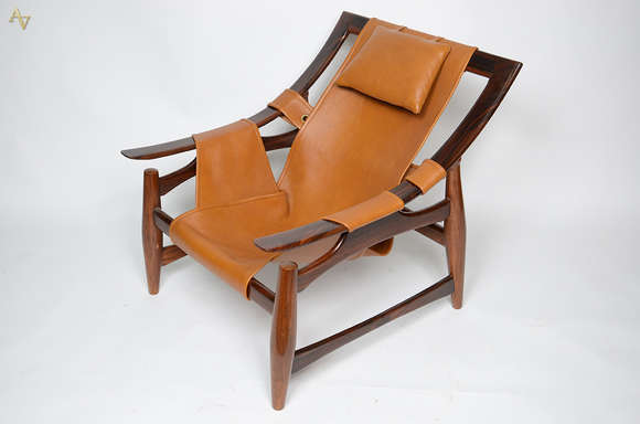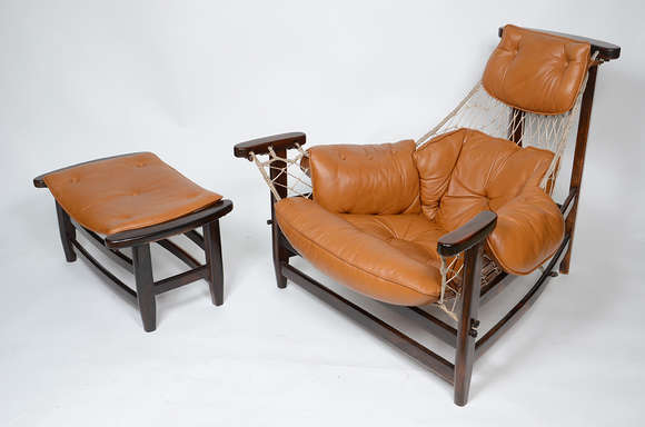 JEAN GILLON - Poltrona "Jangada" de jacarandá e couro, acompanha banqueta.
