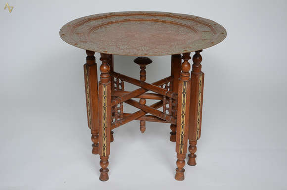 Mesa marroquina com base de madeira marchetada e tampo circular de metal dourado decorado com mandala e flores de lót...
