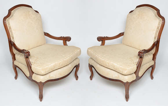 Par de cadeiras com braços de madeira nobre, estofamento forrado com tecido na cor bege..