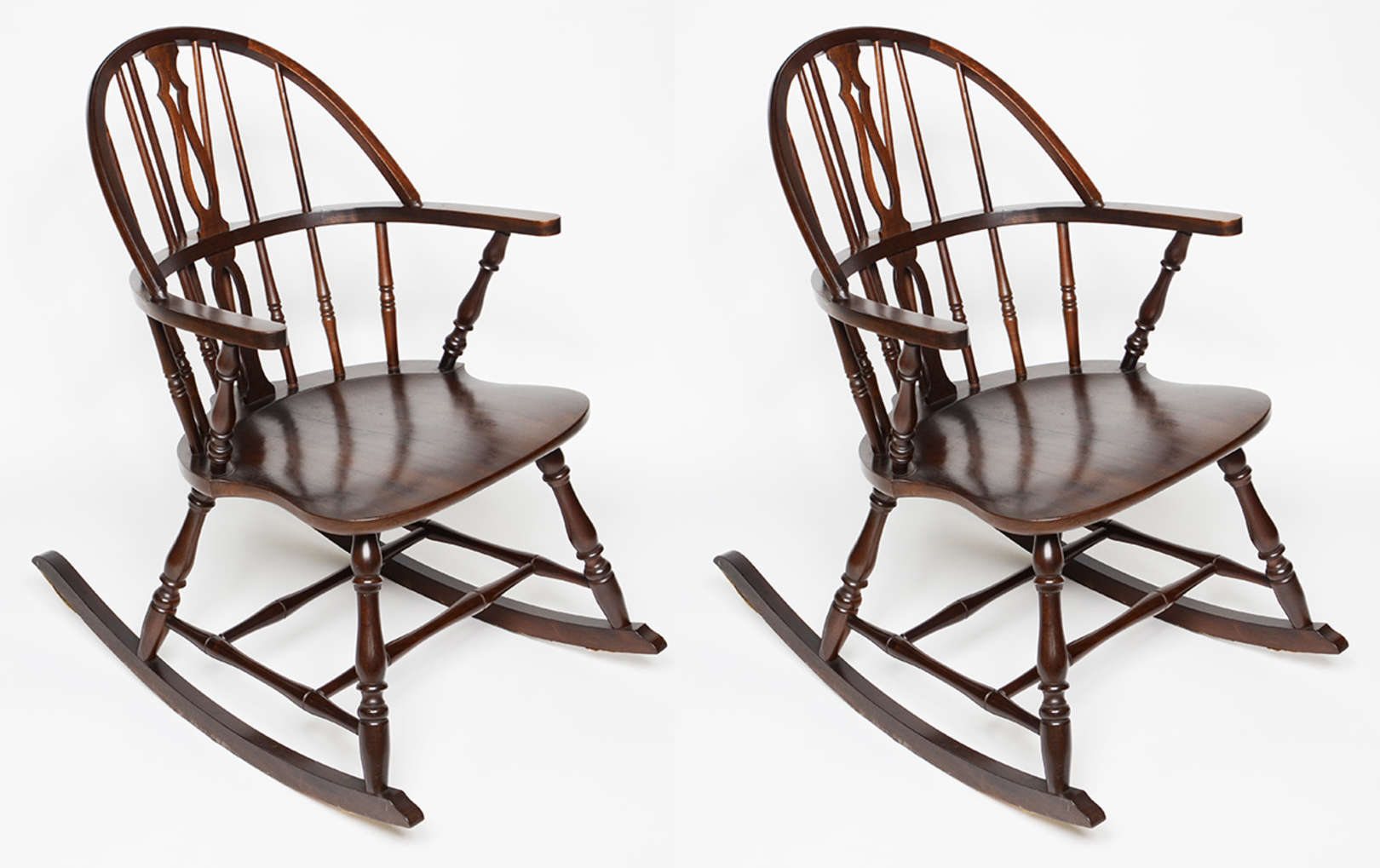 Par de cadeiras de balanço de madeira nobre com varetas torneadas;