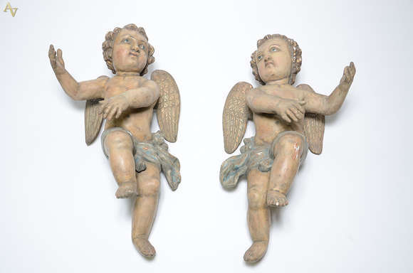 Par de anjos barrocos em madeira policromada, séc. XVIII - São Cristóvão/ SE. Altura 70 cm (apresenta restauro em uma...