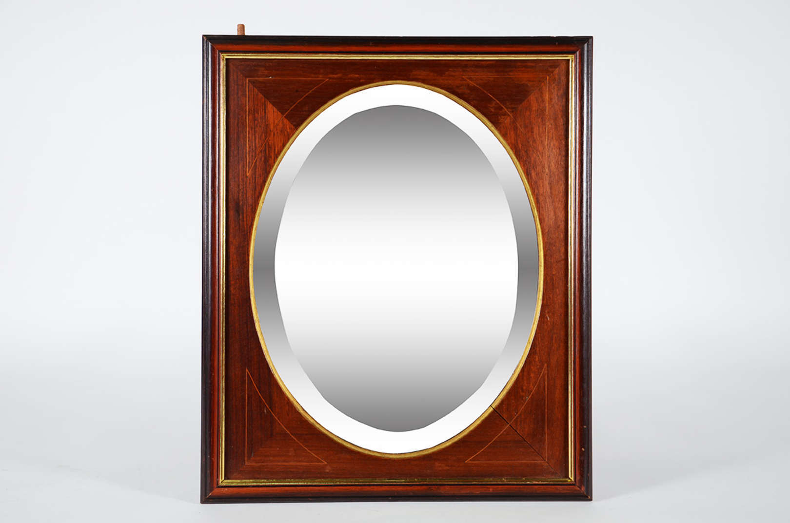 Espelho oval de cristal bisotado, moldura de madeira dourada encimada por guirlanda. Altura total 66 cm.