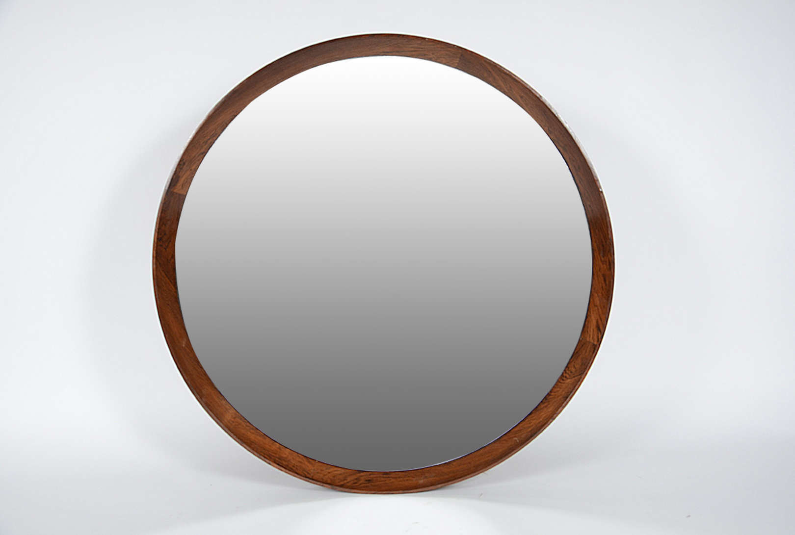 Espelho feitio oval de cristal bisotado com moldura de madeira. Medidas externa 58 x 49 cm.