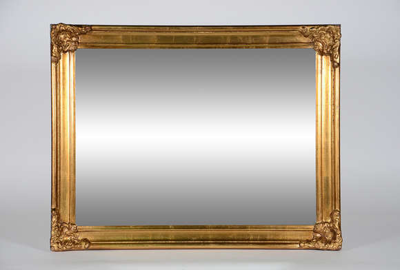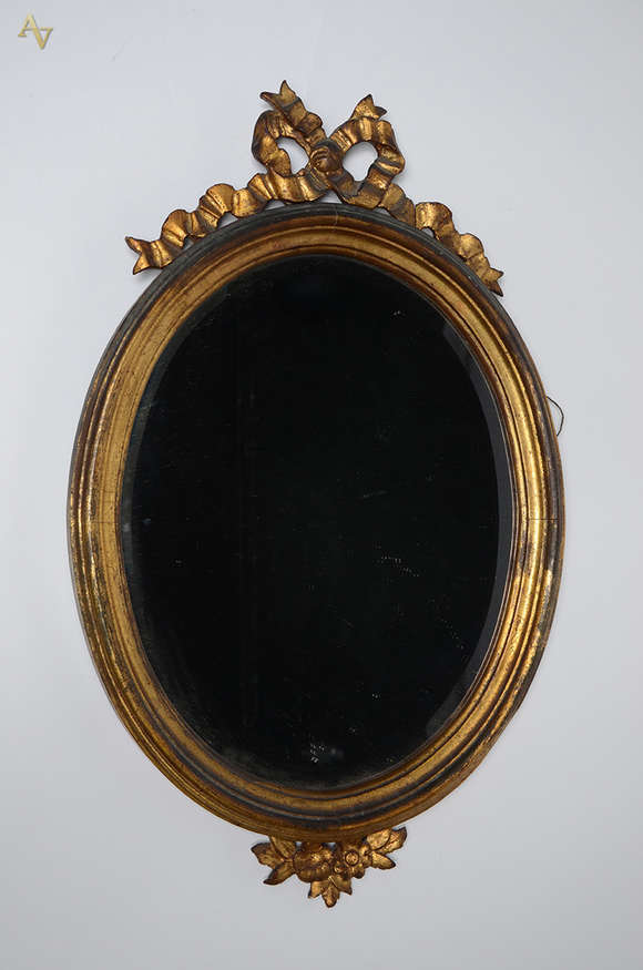 Espelho oval de cristal bisotado, moldura de madeira dourada encimada por guirlanda. Altura total 66 cm.