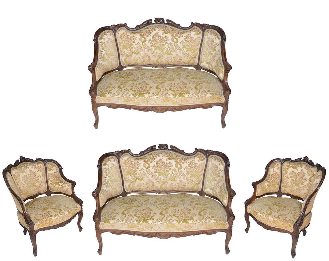 Par de cadeiras de madeira nobre ricamente entalhadas, assentos e encostos estofados e forrados com tecido na cor ver...