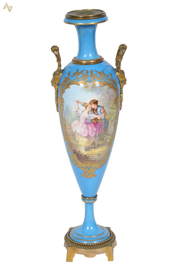 Ânfora de porcelana Sevres azul turquesa decorada com cena romântica em policromia e guarnição de bronze, assinada Ro...