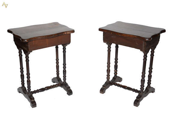 Par de mesas auxiliares de madeira nobre com pernas torneadas. Medidas 0,54 x 0,38 m e altura 0,71 m.