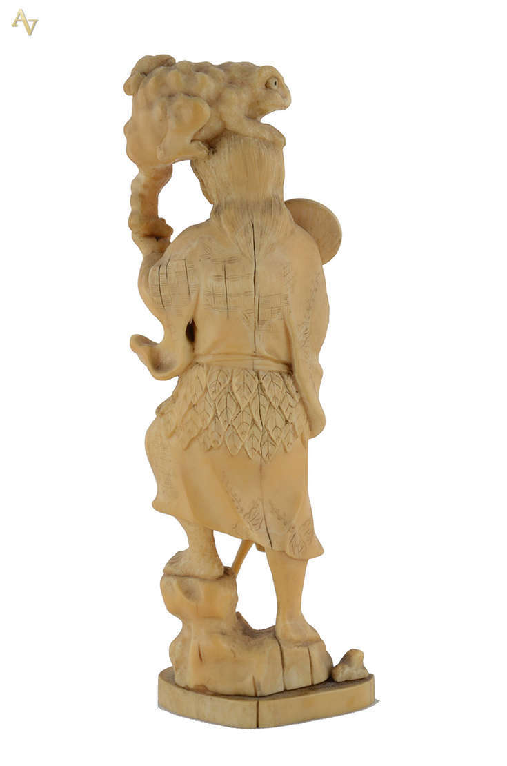 Escultura de marfim representando figura com sapos. Altura 22 cm.