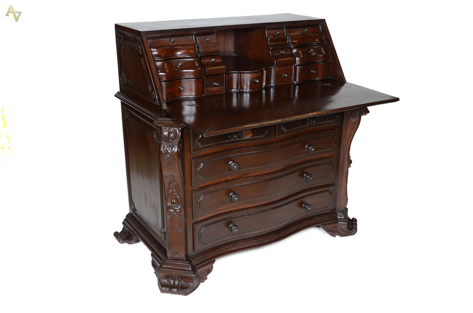 Mesa de encostar de madeira nobre com duas gavetas, pernas retas ligadas por traves inferiores, tampo recoberto por v...
