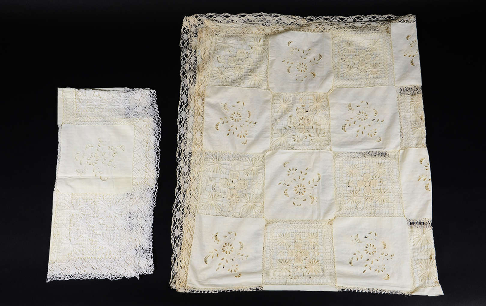 Toalha branca de linho bordado decorada com flores azuis e 12 guardanapos. Total de 13 peças.