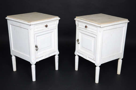 Par de criados mudos patinados de branco com mármore. Medidas 0,38 x 0,38 m e altura 0,61 m.