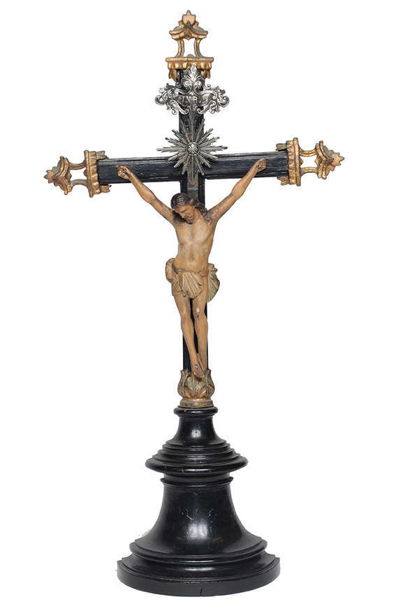 Crucifixo com figura de Cristo de madeira entalhada e policromada, com resplendor.