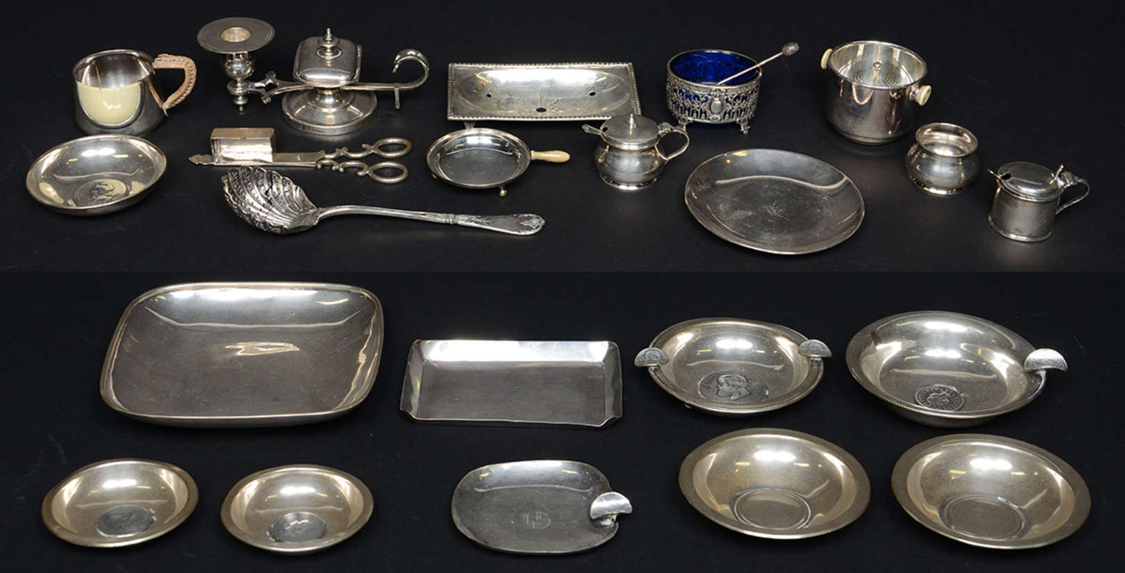 Tinteiro de prata inglesa, parte interna com recipiente de cristal translucido sobreposto de pequeno recipiente de vi...