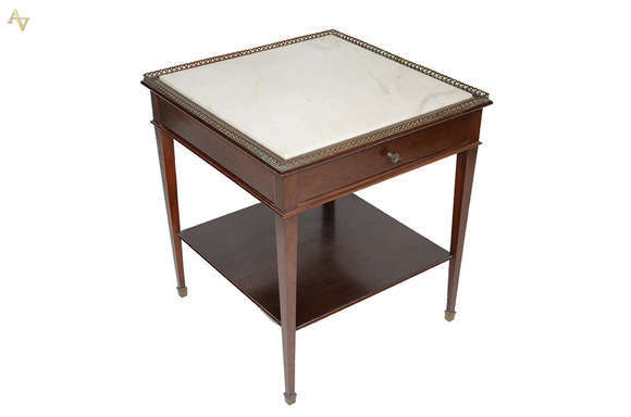 Mesa lateral de madeira nobre com tampo de mármore e cercadura de bronze. Medidas 0,60 x 0,60 m e altura 0,69 m.