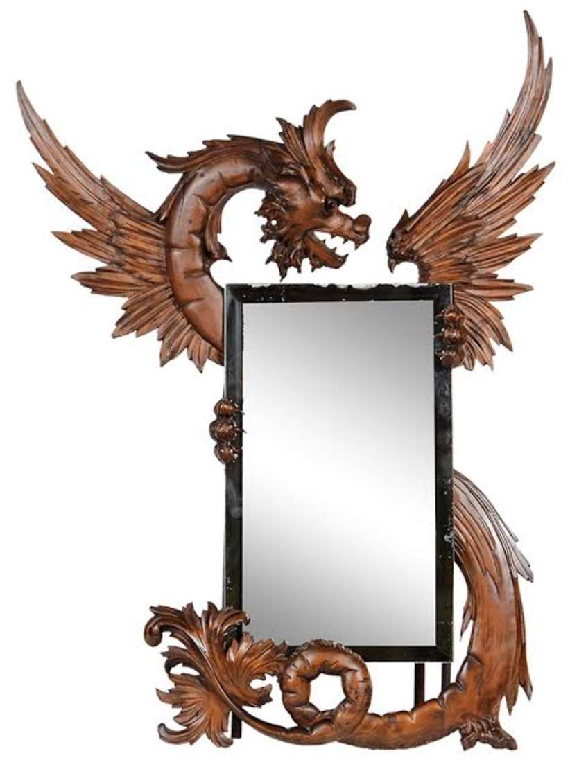 Baú de madeira entalhada com figuras de leões e folhagens.