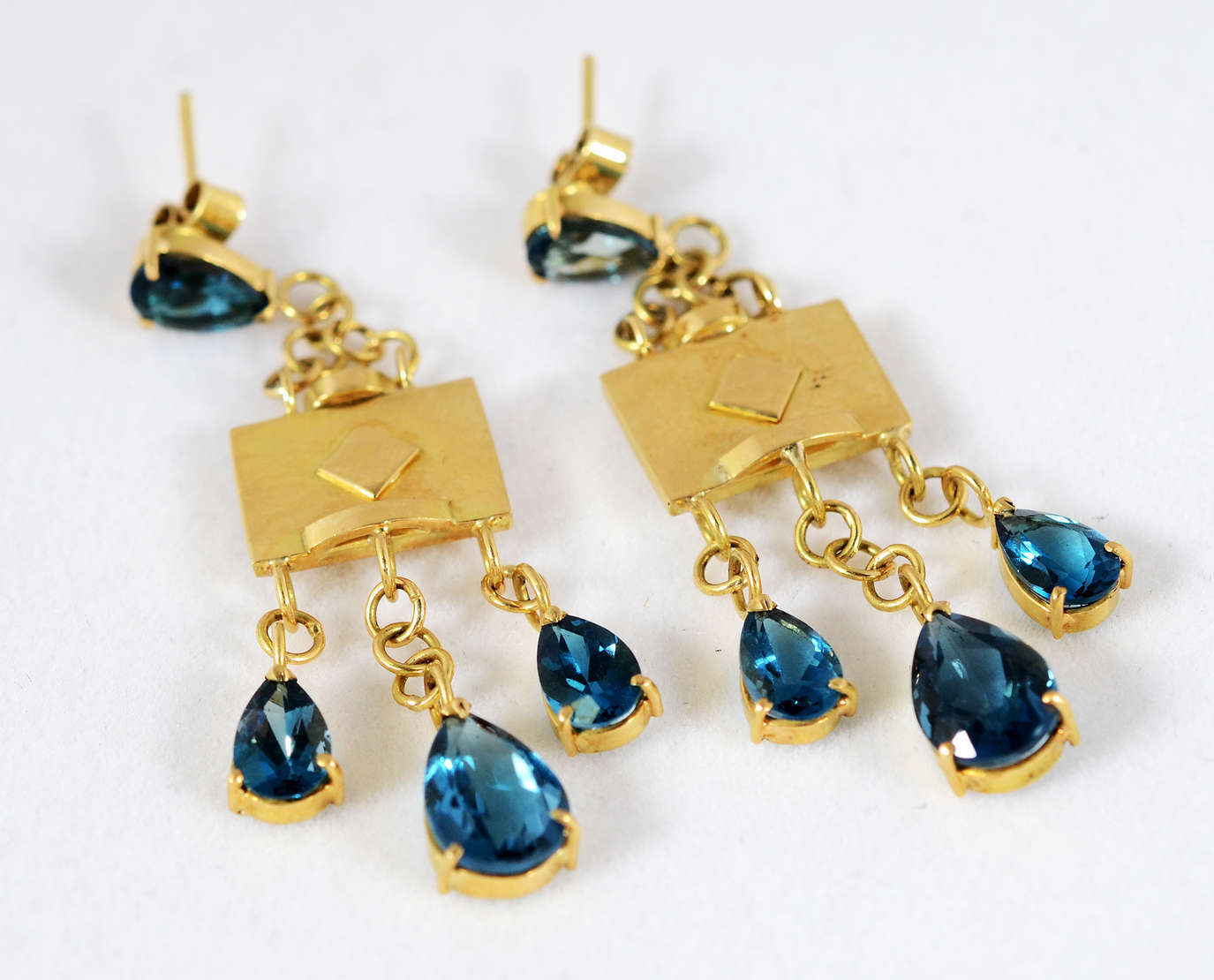 Brinco de ouro 18k com 30 brilhantes e cabochons de turquesas, lapidação ¨gota¨