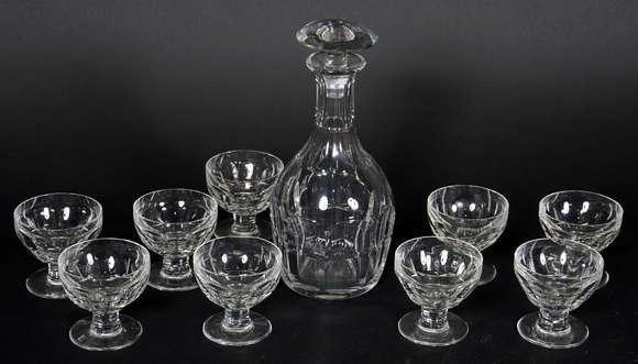 Garrafa para licor e 9 cálices de cristal frances facetado. Marcados na base.