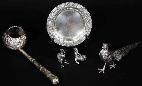 Quatro peças de prata sendo: Par de galinhos , faisão e salva.