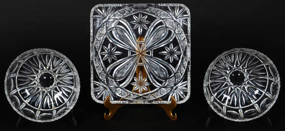 Três peças de cristal tcheco lapidado, sendo : Prato (28 X 28 cm) e dois bowls (20 cm de diâmetro )