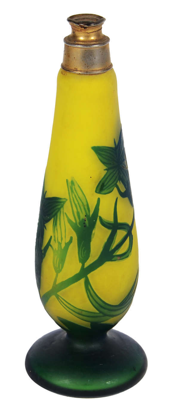 Perfumeiro de pasta de vidro francesa nas cores verde e amarelo ( falta a bomba) . Assinado.