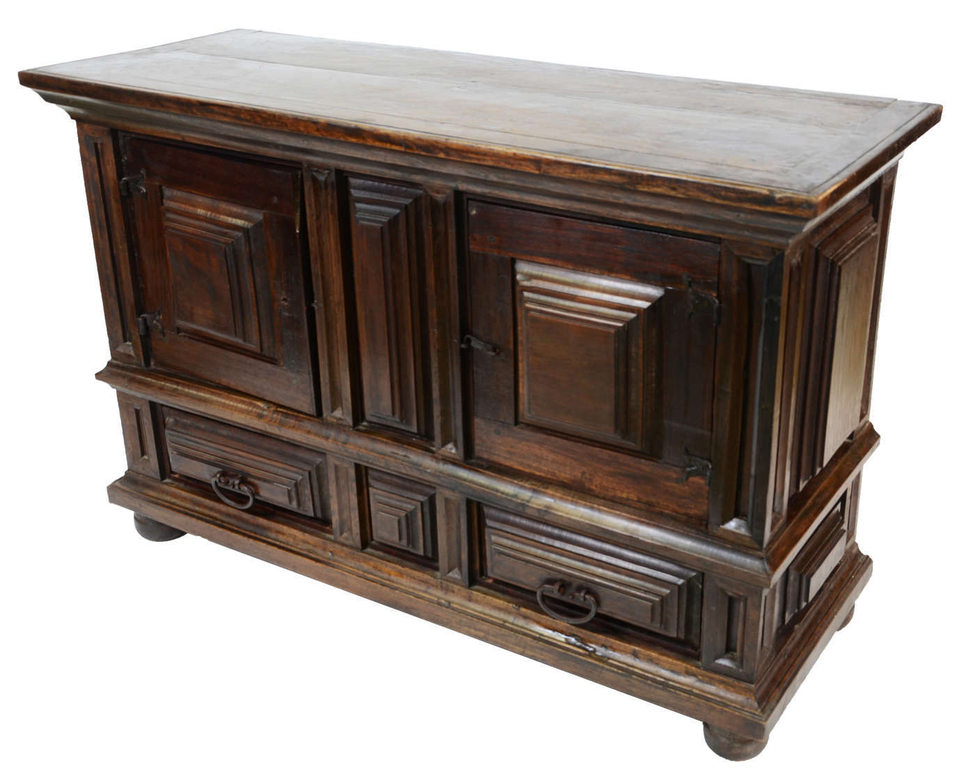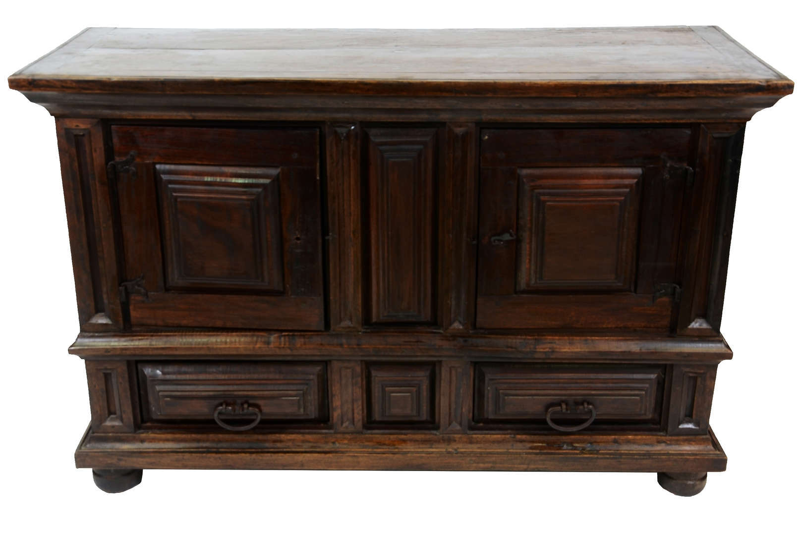 Baú de madeira entalhada com figuras de leões e folhagens.